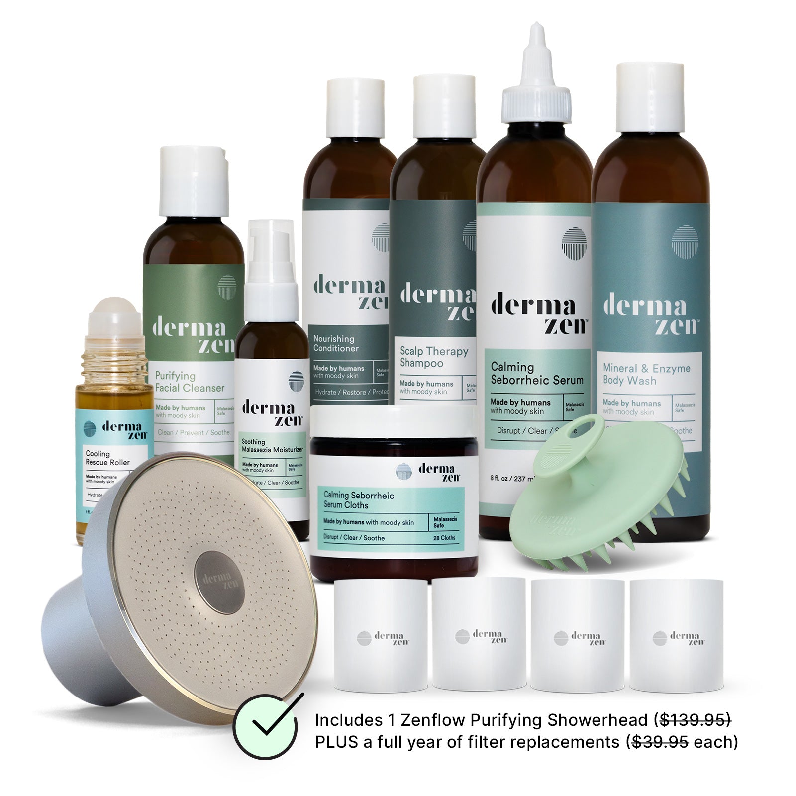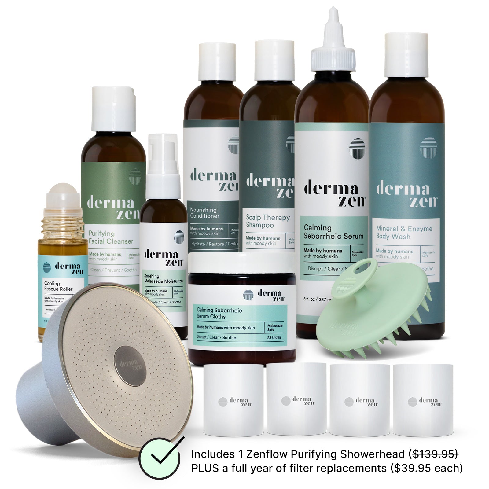 Includes: 8oz Calming Seborrheic Serum, Calming Seborrheic Serum Cloths, Scalp Therapy Shampoo, Nourishing Conditioner, Mineral & Enzyme Body Wash, Daily Purifying Facial Cleanser, Soothing Malassezia Moisturizer, Cooling Rescue Roller, Zenflow Purifying Showerhead, and a 1-year supply of Filter Replacements.